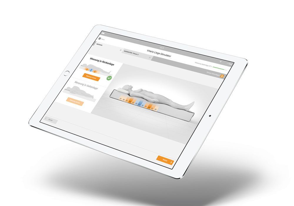 Der Ausgangspunkt jeder VitarioComfort Matratze ist eine Liege-Druck-Messung am Liege-Simulator. Buchstäblich auf Knopfdruck simuliert der Liege-Simulator das zuvor ermittelte Matratzen-Stützprofil sodass die auf den eigenen Körperbau individuell zugeschnittene Bettausstattung im Hinblick auf Liegekomfort und ergonomischer Eignung bereits im Studio überprüft werden kann.